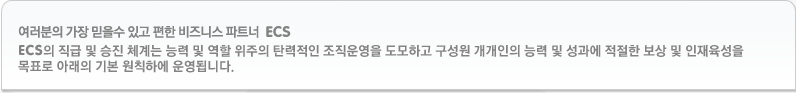 ¶ÇÇÑ, ¿ì¸® ȸ»ç´Â ÀÎÀçÀÇ ¼ÒÁßÇÔÀ» ¾Ë°í Á÷¿øµéÀÇ ¶¡°ú ³ë·ÂÀ» ÀÎÁ¤ÇÏ¸ç ±×¿¡ µû¸¥ º¸»ó¿¡ ÀλöÇÏÁö ¾Ê½À´Ï´Ù.Ç×»ó ¾Õ¼± ºñÁ¯À» °¡Áö°í ȸ»ç¸¦ À̲ø¾î°¡½Ã´Â »çÀå´Ô ÀÌÇÏ ¶ÇÇÑ ¾÷°è¿¡¼ ³»³ë¶óÇÏ´Â ´É·ÂÀ» °¡Áø Á÷¿øµéÀÌ °¡Á·Ã³·³ ¼·Î¸¦ ¾Æ³¢°í »ç¶ûÇϸç Å« ÈûÀÌ µÇ¾îÁÖ´Â ÁÁÀº ȸ»ç, ECSÀÔ´Ï´Ù. µµÀüÇϽʽÿÀ! ¿©·¯ºÐÀÇ ¼º°øÀÇ ¹®ÀÌ µÉ °ÍÀÔ´Ï´Ù.