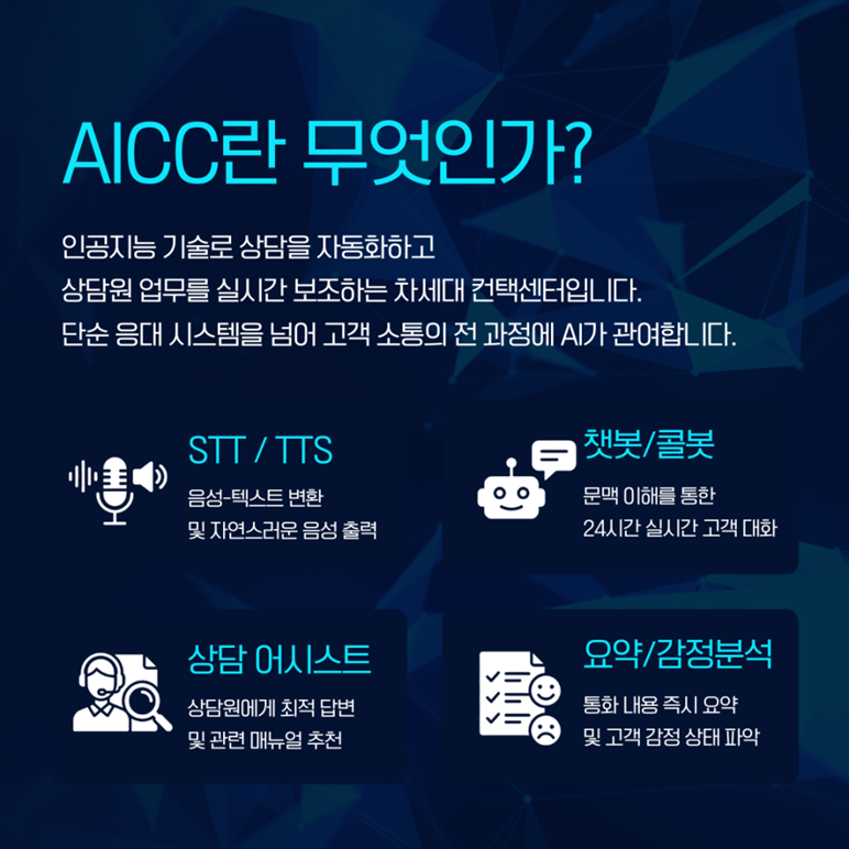 AICC(AI Contact Center)는 인공지능 기술을 활용해 고객 상담을 자동화하고, 상담원의 업무를 실시간으로 보조하는 차세대 컨택센터 시스템입니다.